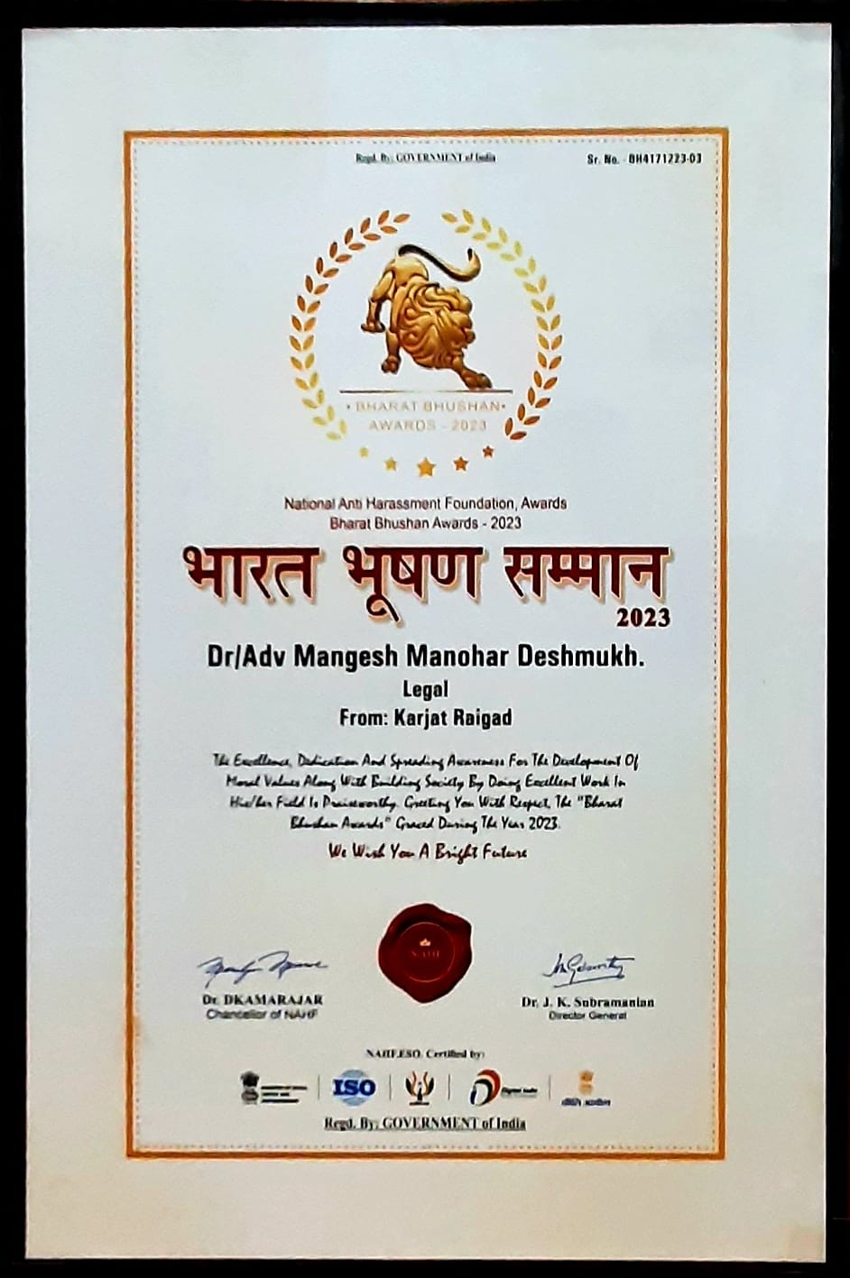 “Law and justice are the pillars of a society's integrity, ensuring fairness and righteousness prevail in every interaction and decision” MANGESH MANOHAR DESHMUKH